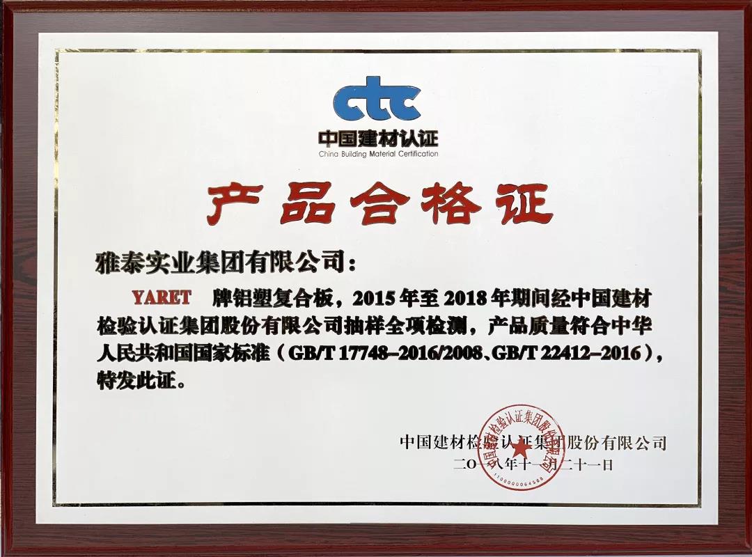 會上,雅泰產(chǎn)品憑借2008年至今2018年期間質(zhì)量體系持續(xù)滿足CTC/TVL-OP02《建筑裝飾用金屬及金屬復(fù)合材料產(chǎn)品認證實施規(guī)則》,榮獲2018年度CTC產(chǎn)品質(zhì)量認證優(yōu)秀獎。YARET牌鋁塑復(fù)合板,2015年至2018年期間經(jīng)中國建材檢驗認證集團股份有限公司抽樣全項檢測,產(chǎn)品質(zhì)量符合中華人民共和國國家標準(GB/T 17748-2016/2008、GB/T22412-2016),被授予2018年度產(chǎn)品合格證。