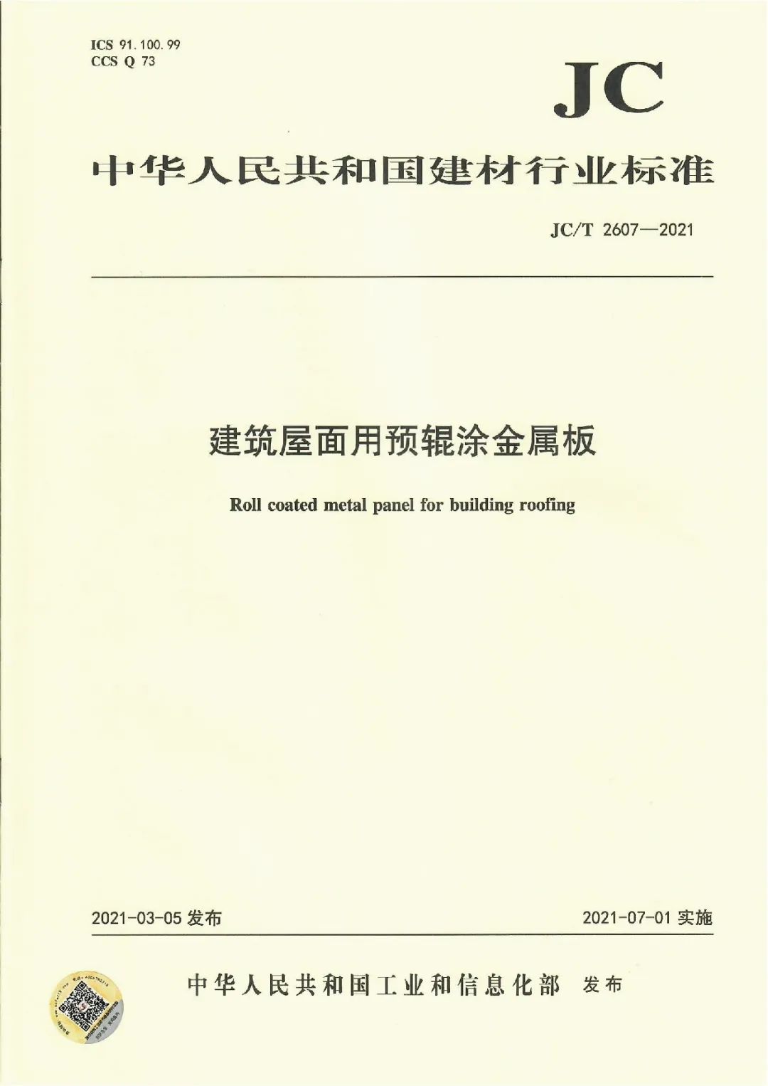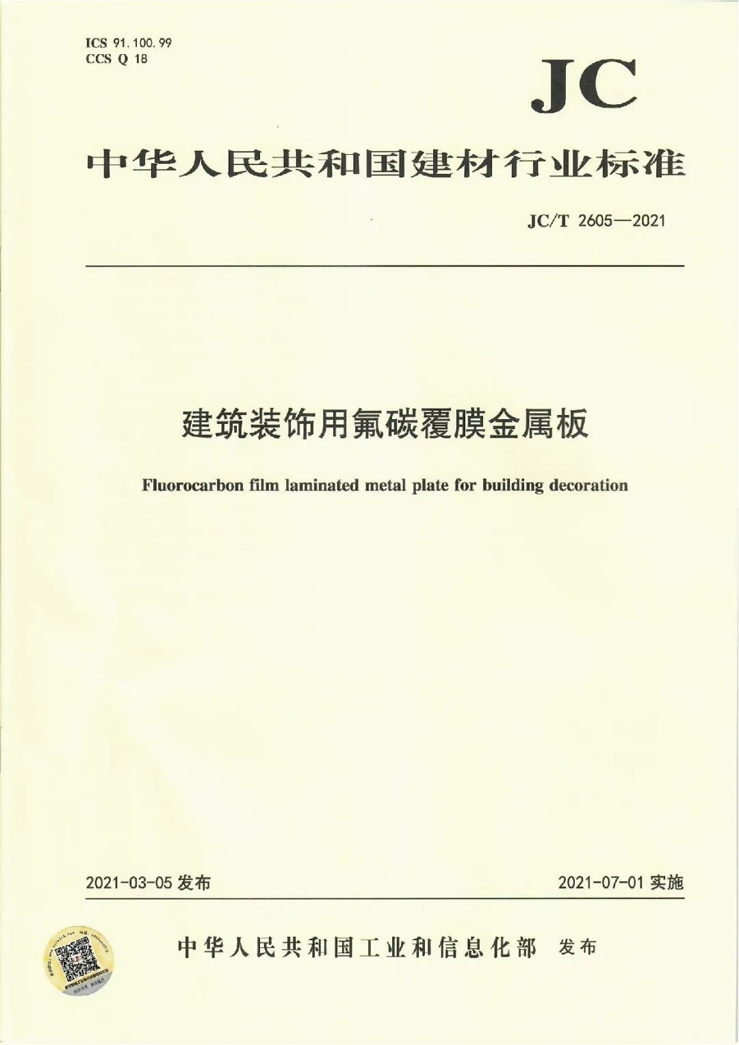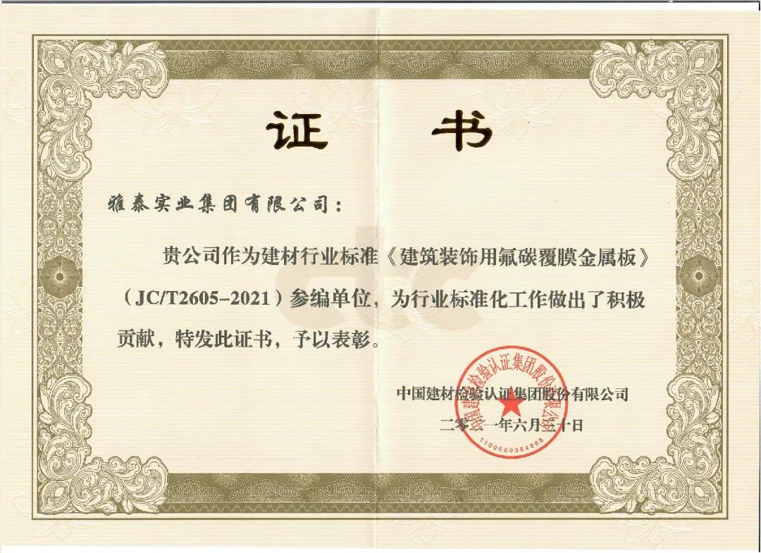近日,由中國建筑材料聯(lián)合會提出,雅泰實(shí)業(yè)集團(tuán)參與起草的《JC/T2605-2021建筑裝飾用氟碳覆膜金屬板》、《JC/T2607-2021建筑屋面用預(yù)輥涂金屬板》兩項(xiàng)行業(yè)標(biāo)準(zhǔn)于2021年3月5日發(fā)布,同年7月1日正式實(shí)施,公司技術(shù)部經(jīng)理林葉挺為此次兩項(xiàng)行業(yè)標(biāo)準(zhǔn)的主要起草人之一。